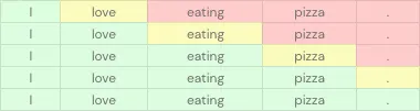 For instance, this table shows how these models work. The green cells represent the input, the yellow cells represent the token to predict, and the red cells represent the tokens to ignore.